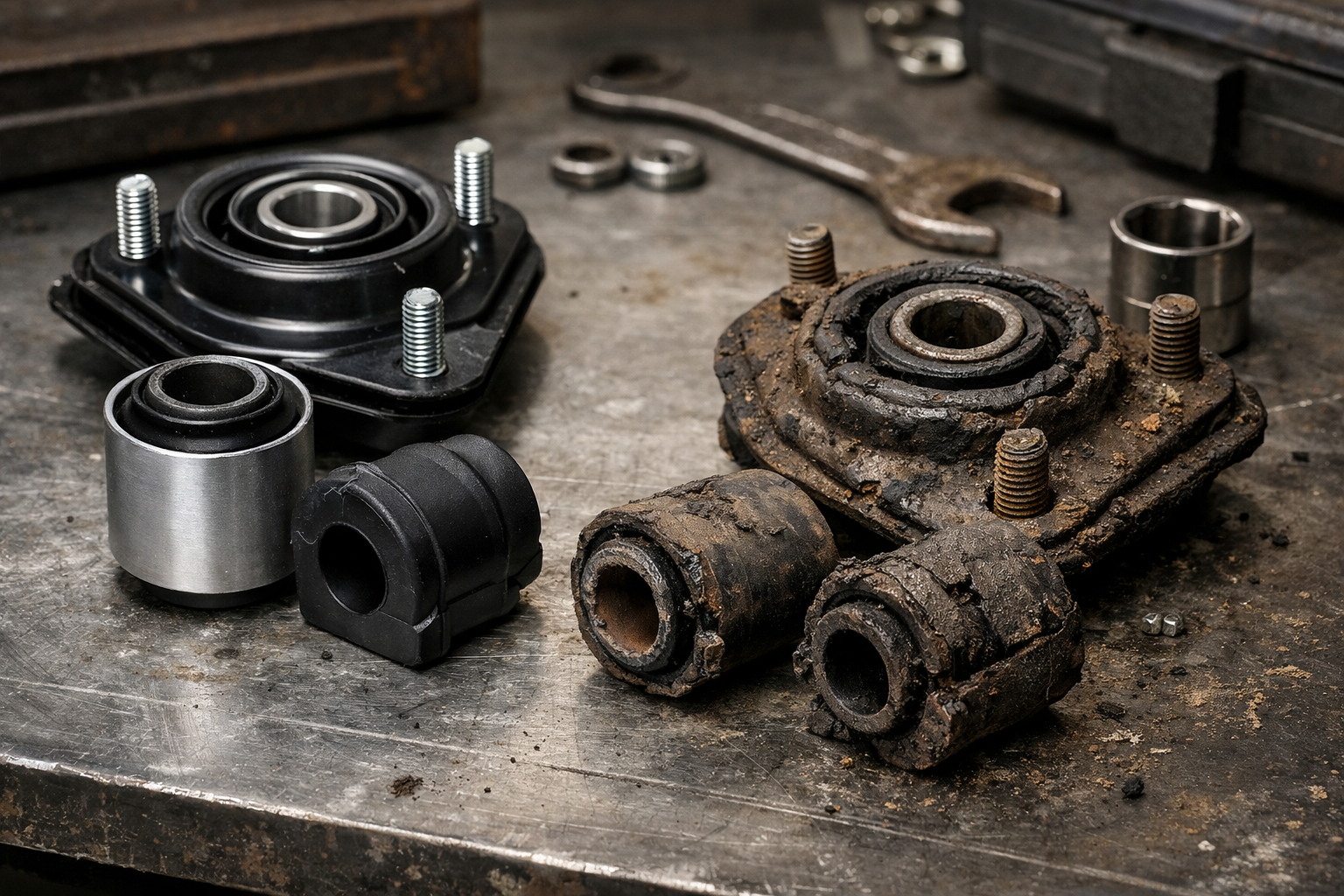 | Сайлентблоки и втулки | Глухие, сопровождаемые ухудшением управляемости авто | Износ элементов, появление на них дефектов происходят по аналогичным причинам; эти процессы, в свою очередь, спровоцированы: перегрузками авто, нарушениями геометрии подвески, воздействиями агрессивных сред, коррозией |